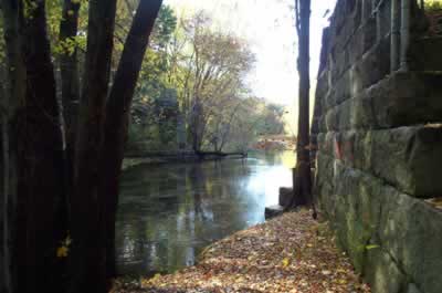 This picture shows the bridge abutment on the northwest side of the river and a view upstream of the Assabet River flowing lazily on a fall day. Since there is no bridge now, the river chops the trail into two segments in Concord.