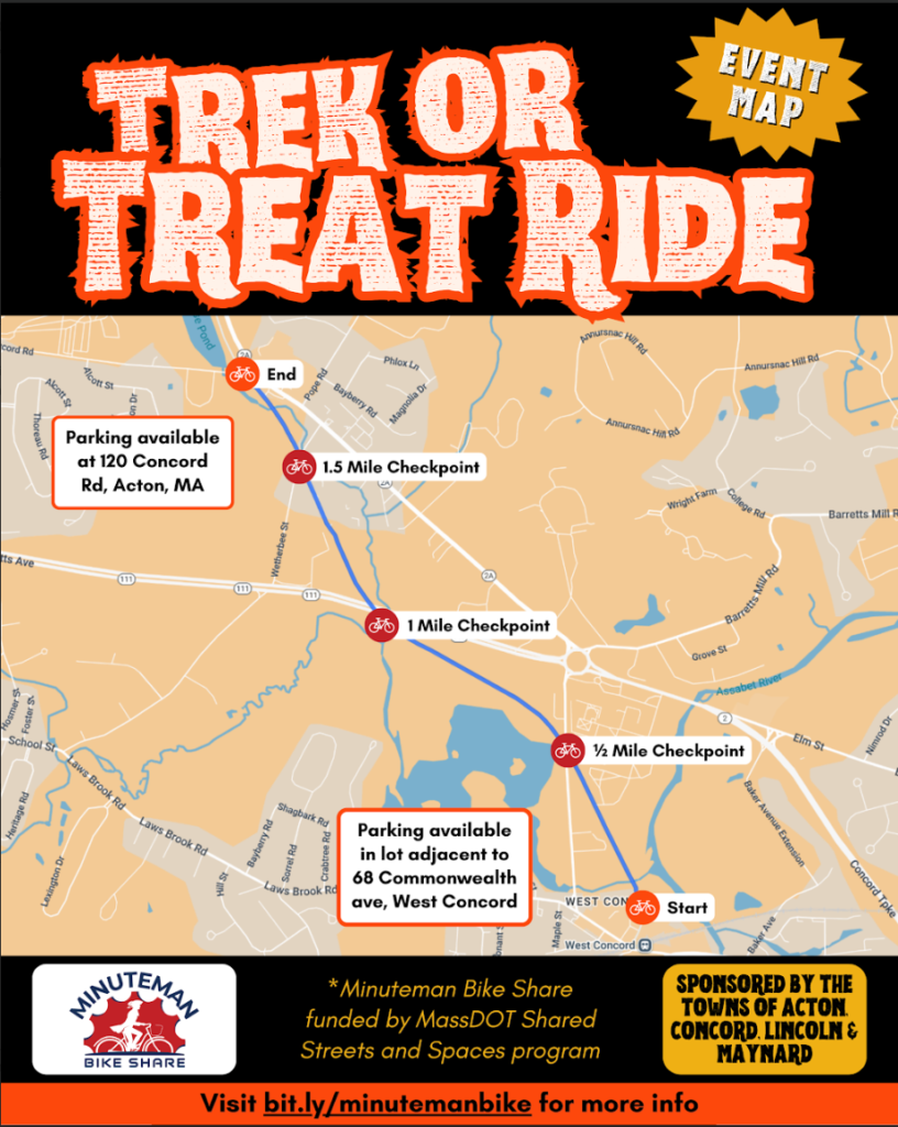 On Wednesday, Oct. 29, 3 to 4 p.m. “Trek and Treat” Halloween Bike Ride. Meet at the West Concord Bike Share and bicycle to East Acton Village Green (1.9 miles on the BFRT).